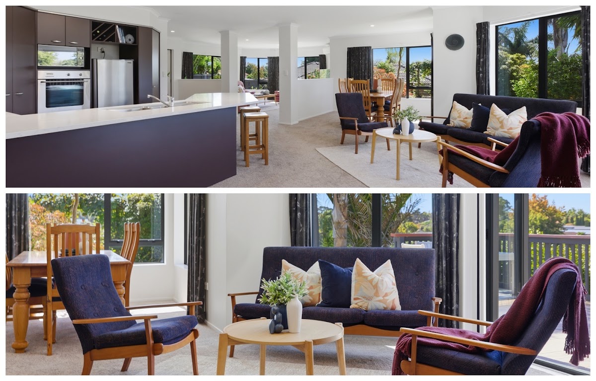 Step from the indoor living straight onto an elevated deck with sweeping views of rolling rural hills towards Mount Maunganui – ideal for alfresco dining or sunny brunches.