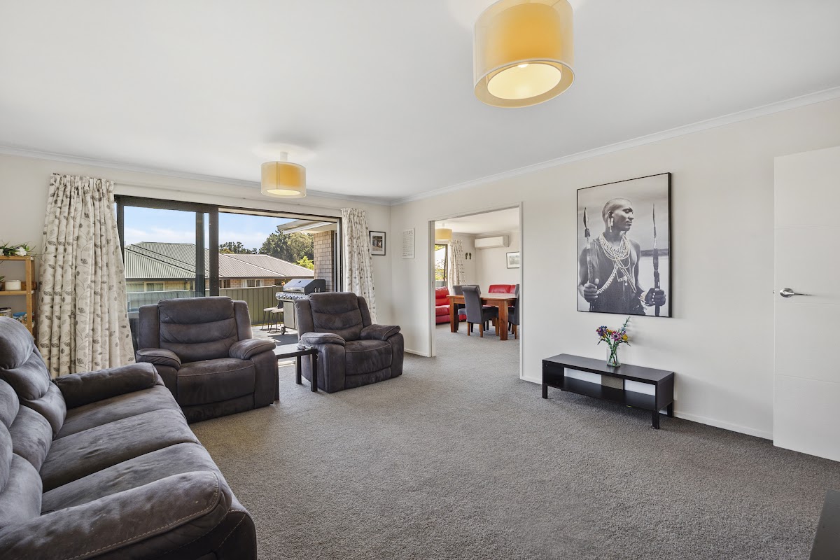 The adjoining dining and living area is flooded with natural light. Cavity sliders allow the lounge to be closed off for intimacy or opened up to accommodate larger gatherings. Both living areas connect with the outdoors through stacker doors, one to a sunny concrete patio providing the ideal spot to dive into a good book, while the other to a large deck where you can entertain guests as you soak in the scenic views of Wingatui racecourse and the surrounding hills.