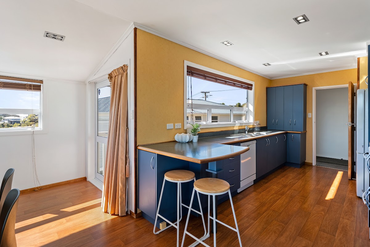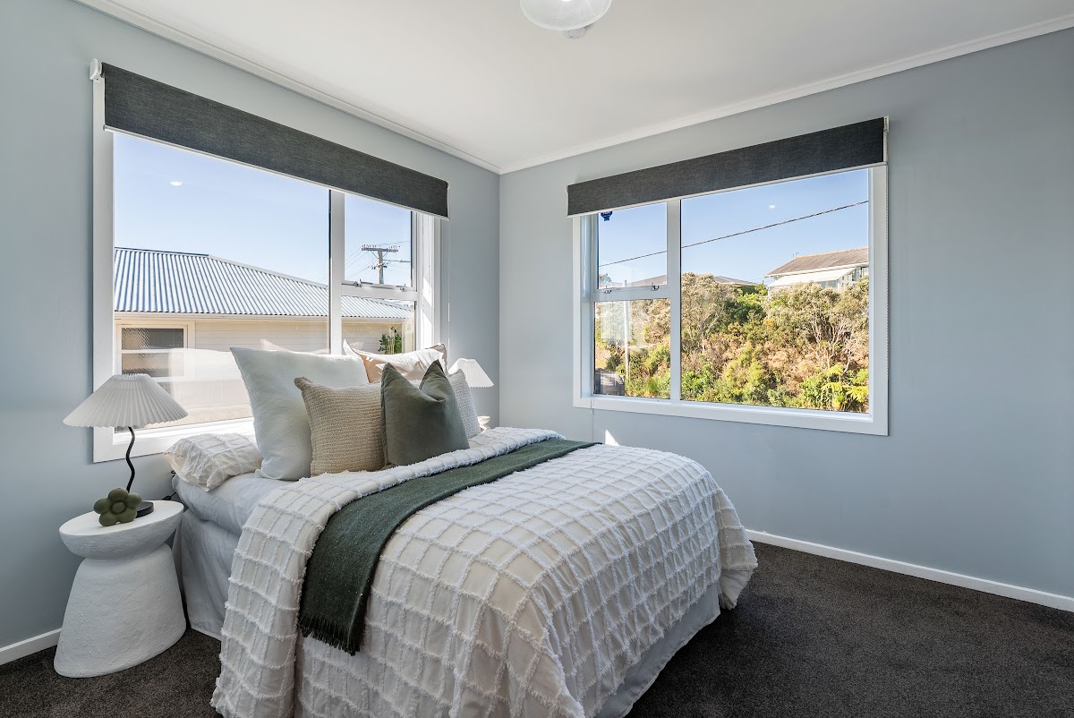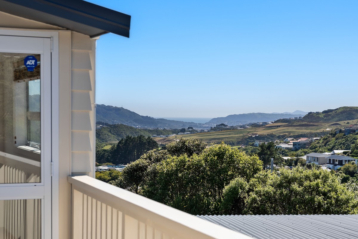 Filled with natural light, the freshly painted living space feels warm and welcoming from the moment you step inside. Designed to capture all-day sun, the home offers a bright, uplifting atmosphere throughout. The outlook adds something truly special — northern views stretch across Newlands all the way to Kapiti Island, while to the west, you’ll enjoy wind turbines set against spectacular sunsets.